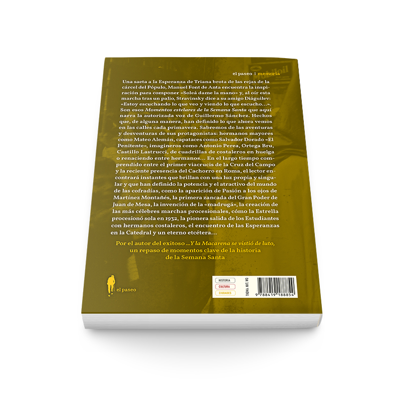 Una saeta a la Esperanza de Triana brota de las rejas de la cárcel del Pópulo, Manuel Font de Anta encuentra la inspiración para componer «Soleá dame la mano» y, al oír esta marcha tras un palio, Stravinsky dice a su amigo Diáguilev: «Estoy escuchando lo que veo y viendo lo que escucho…». Son esos Momentos estelares de la Semana Santa que aquí narra la autorizada voz de Guillermo Sánchez. Hechos que, de alguna manera, han definido lo que ahora vemos en las calles cada primavera. Sabremos de las aventuras y desventuras de sus protagonistas: hermanos mayores como Mateo Alemán, capataces como Salvador Dorado «El Penitente», imagineros como Antonio Perea, Ortega Bru, Castillo Lastrucci, de cuadrillas de costaleros en huelga o renaciendo entre hermanos… En el largo tiempo comprendido entre el primer viacrucis de la Cruz del Campo y la reciente presencia del Cachorro en Roma, el lector encontrará instantes que brillan con una luz propia y singular y que han definido la potencia y el atractivo del mundo de las cofradías, como la aparición de Pasión a los ojos de Martínez Montañés, la primera zancada del Gran Poder de Juan de Mesa, la invención de la «madrugá», la creación de las más célebres marchas procesionales, cómo la Estrella procesionó sola en 1932, la pionera salida de los Estudiantes con hermanos costaleros, el encuentro de las Esperanzas en la Catedral y un eterno etcétera…